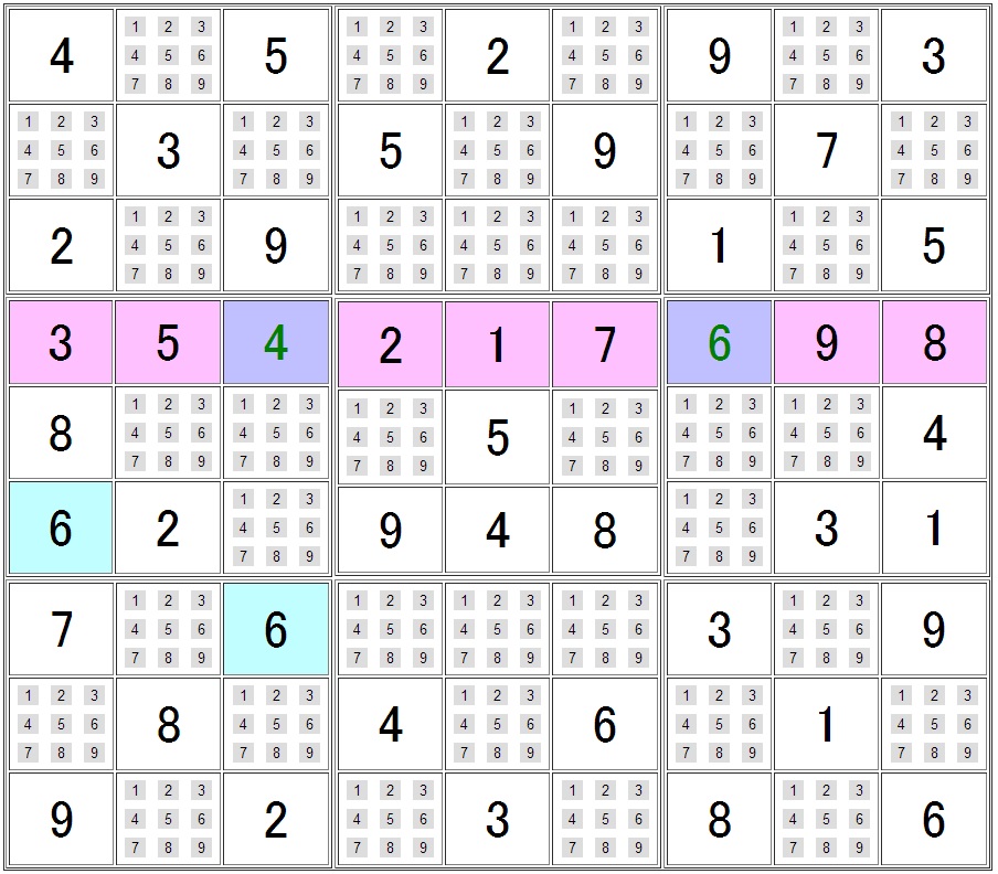 横方向の行の例: 本サイト内の五級の問題で、「ワンステップ実行」をした場合です。 ピンク色の行では二つのマスだけが残っていて数字は4と6が残っています。 水色のマスに6があるので6が入れるマスが決まり、従って4のマスも決まります。 | ||