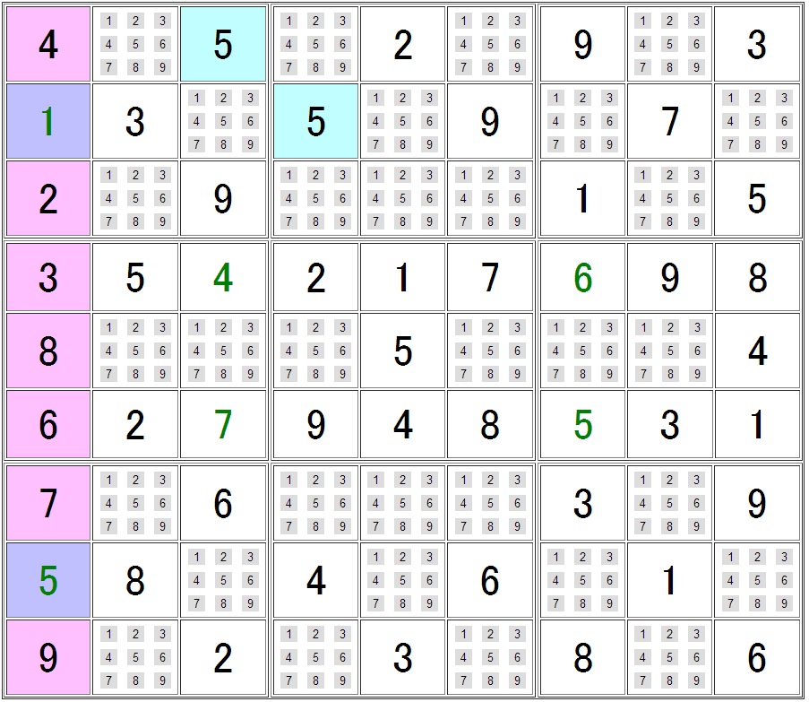 縦方向の列の例: 本サイト内の五級の問題で、「ワンステップ実行」を3回クリックした場合です。 左端のピンク色の列では二つのマスだけが残っていて数字は1と5が残っています。 水色のマスに5があるので5が入れるマスが決まり、従って1のマスも決まります。 | ||