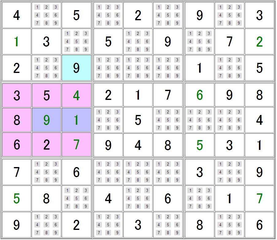 3×3のブロックの例: 本サイト内の五級の問題で、「ワンステップ実行」を5回クリックした場合です。 ピンク色のブロックでは二つのマスだけが残っていて数字は1と9が残っています。 水色のマスに9があるので9が入れるマスが決まり、従って1のマスも決まります。 | ||